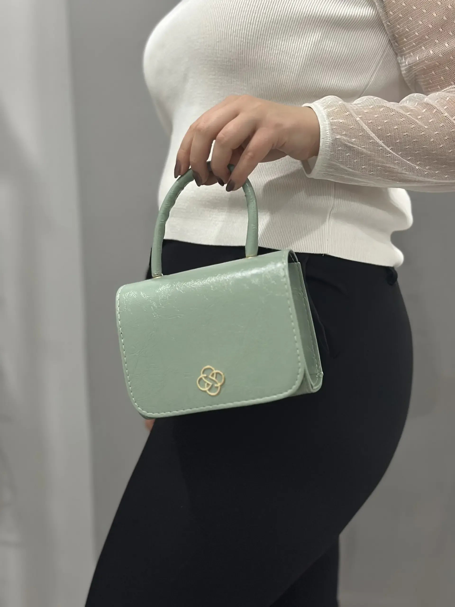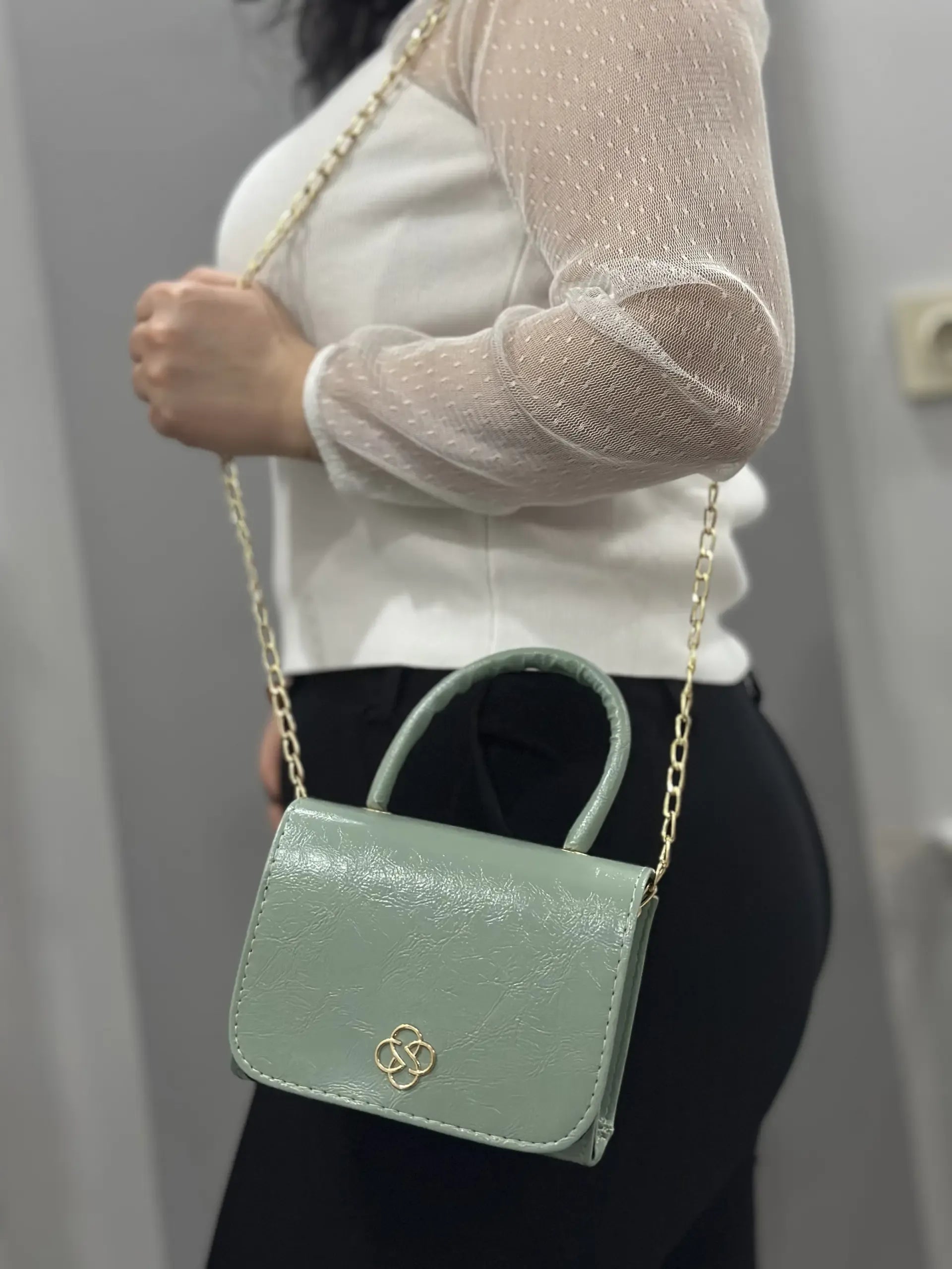 Parlak Rugan Mini Çanta - Gold Zincirli ve Saplı | Su Yeşili