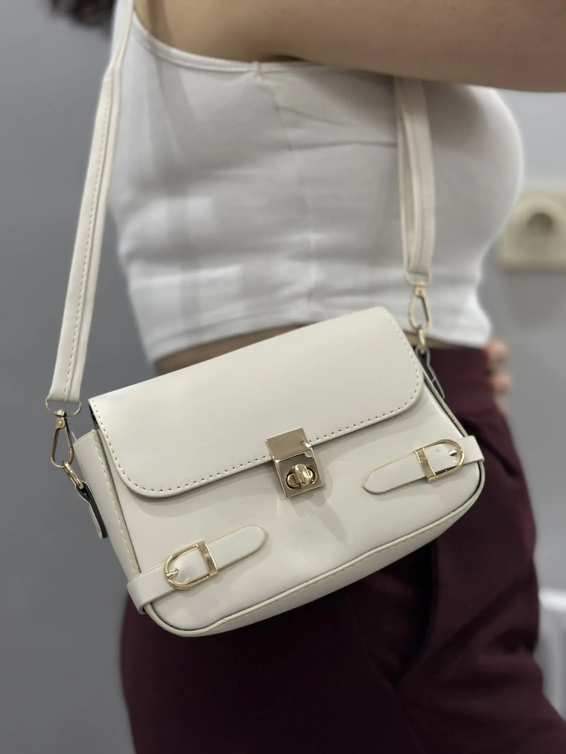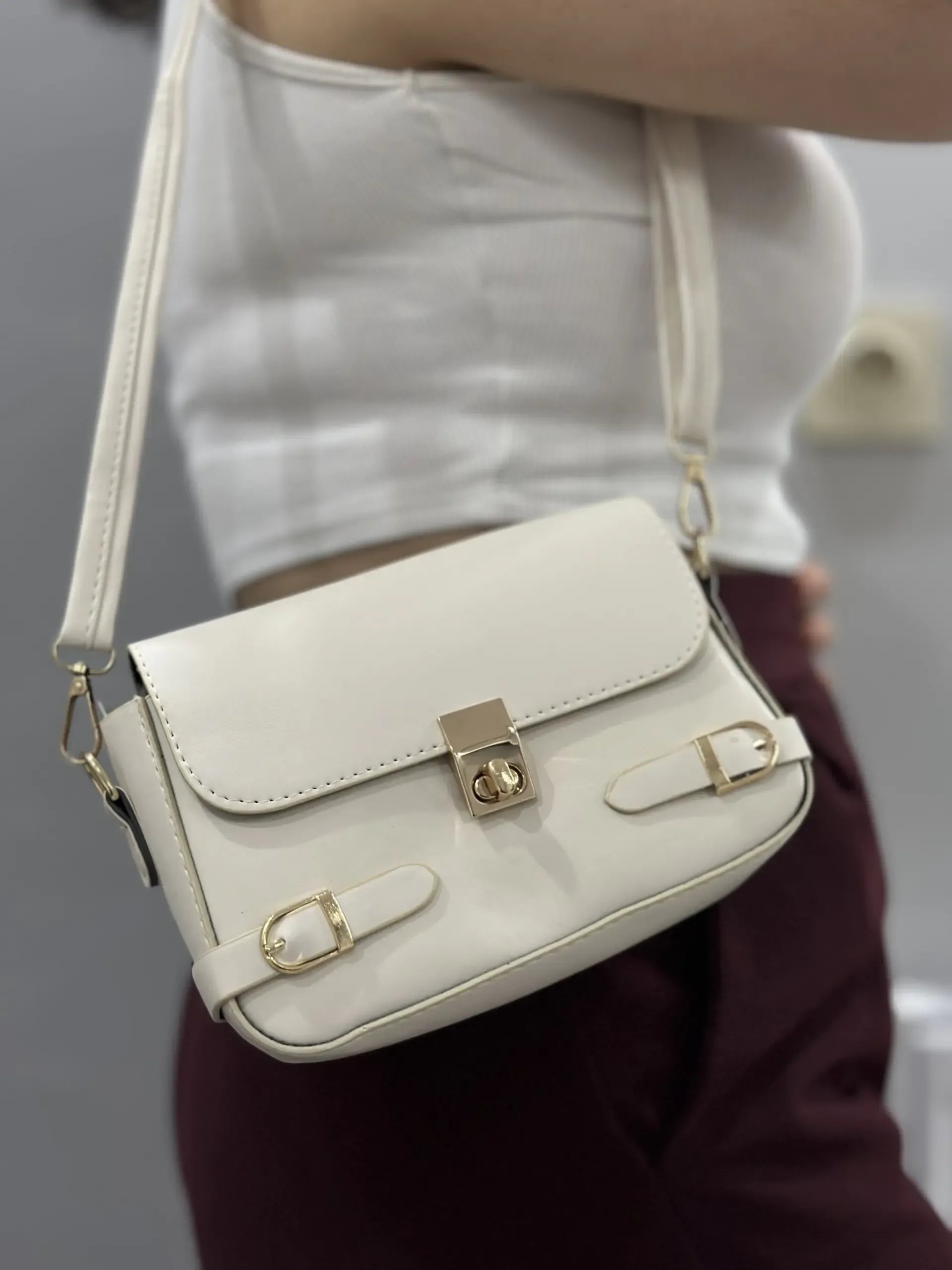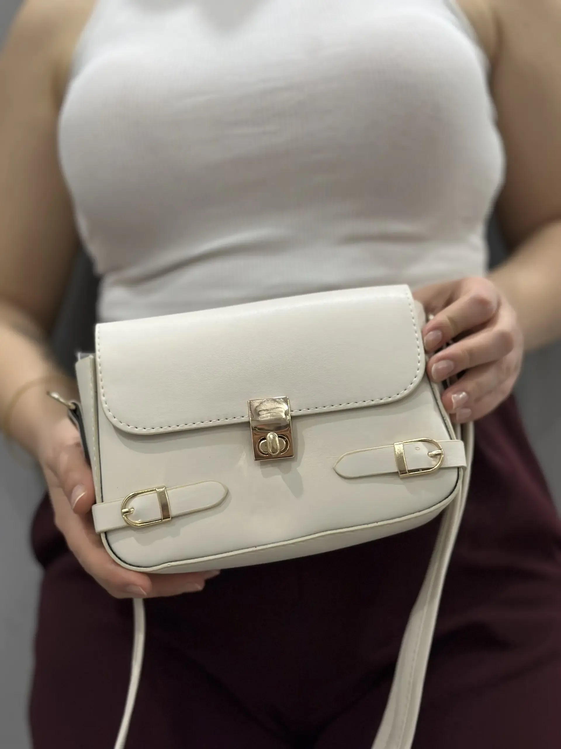 Tokalı Kapaklı Çapraz Çanta - Günlük Şıklık ve Kalite | Bej/Krem Rengi